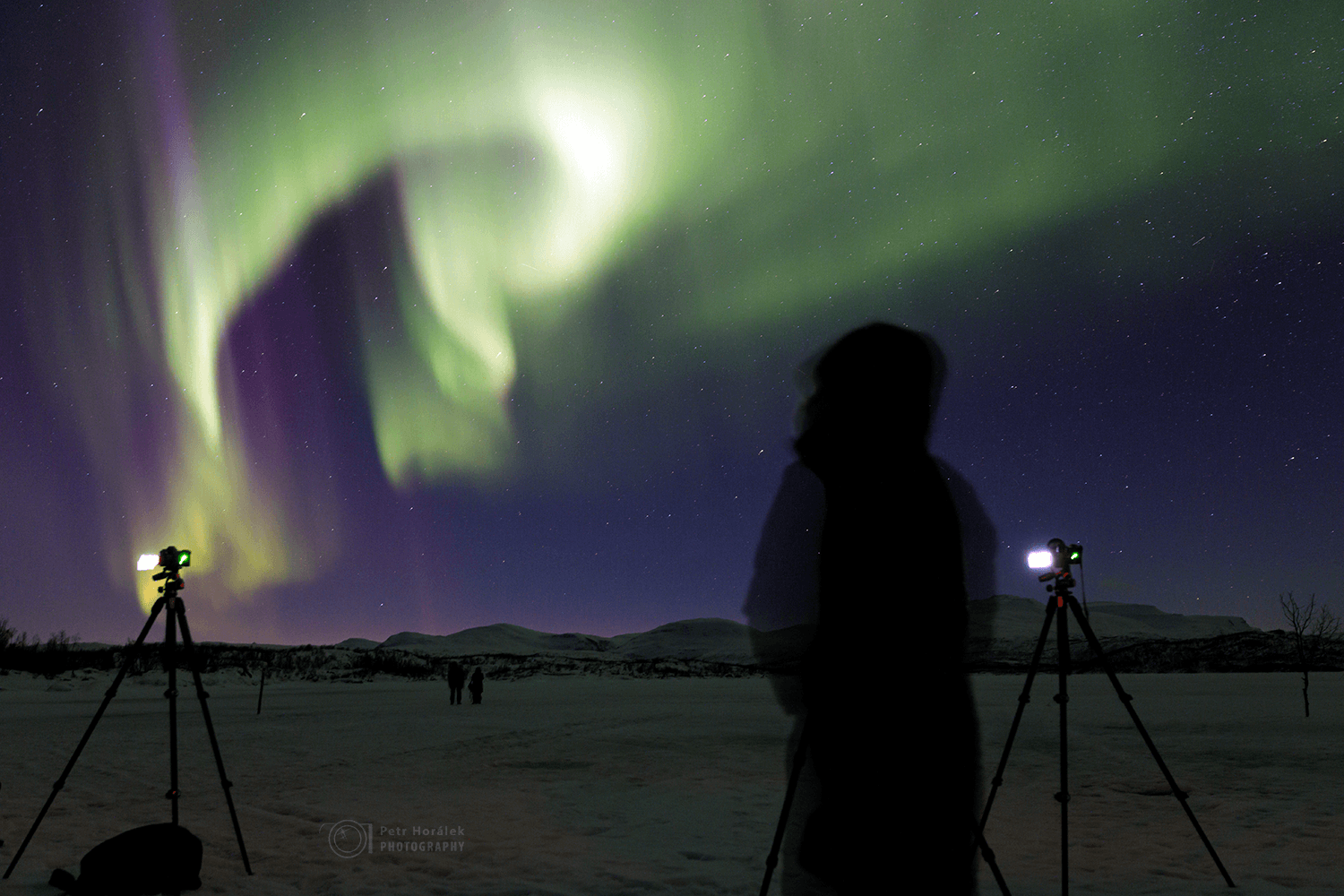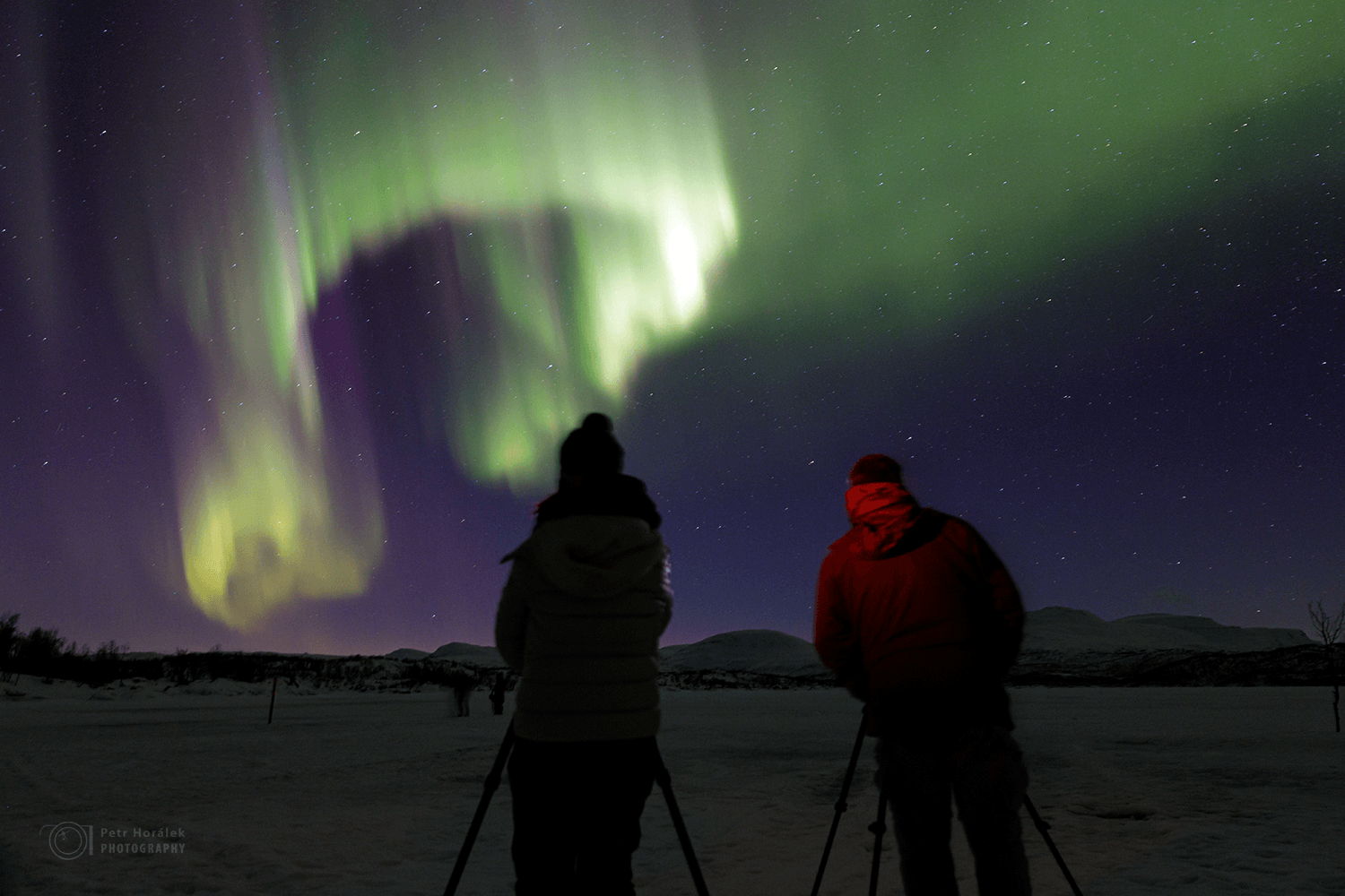 A v čem že jsme se přepočítali? Mnou zvolené místo jsem znal už léta jako zcela odtržené od ziskuchtivých komerčních výjezdů místních agentur. Ovšem zájem o auroru a hlavně omezené kapacity na ověřených parkovištích zjevně za ty roky vzaly za své a ti pacholci z agentur už tohle idylické místo taky našli. A nejen to, ve velkém si jej začali náhodně nárokovat pro své služby. My, zašití 500 metrů daleko od hlavního dění na tom parkovišti, jsme o ty tlačenice byli ušetřeni, ale jednu epizodku nám přeci jen ten vysmátý Ódin, sedící někde na té duhové Valhalle nad námi, daroval. O asi půl jedenácté, zrovna když začaly padat první pozitivní reakce na ten dnešní divoký pozorovací flek, se záhy z daleké příjezdové cesty natáhly obří kužele bílých dálkových světel. Rozhodný a patřičně rozzuřený Vojan se rozhodl to jít řešit. Zvědavost nakonec odvedla i Lucku a tmavé nebe s už beztak pěknými závěsy polární záře ztratilo svůj prim.