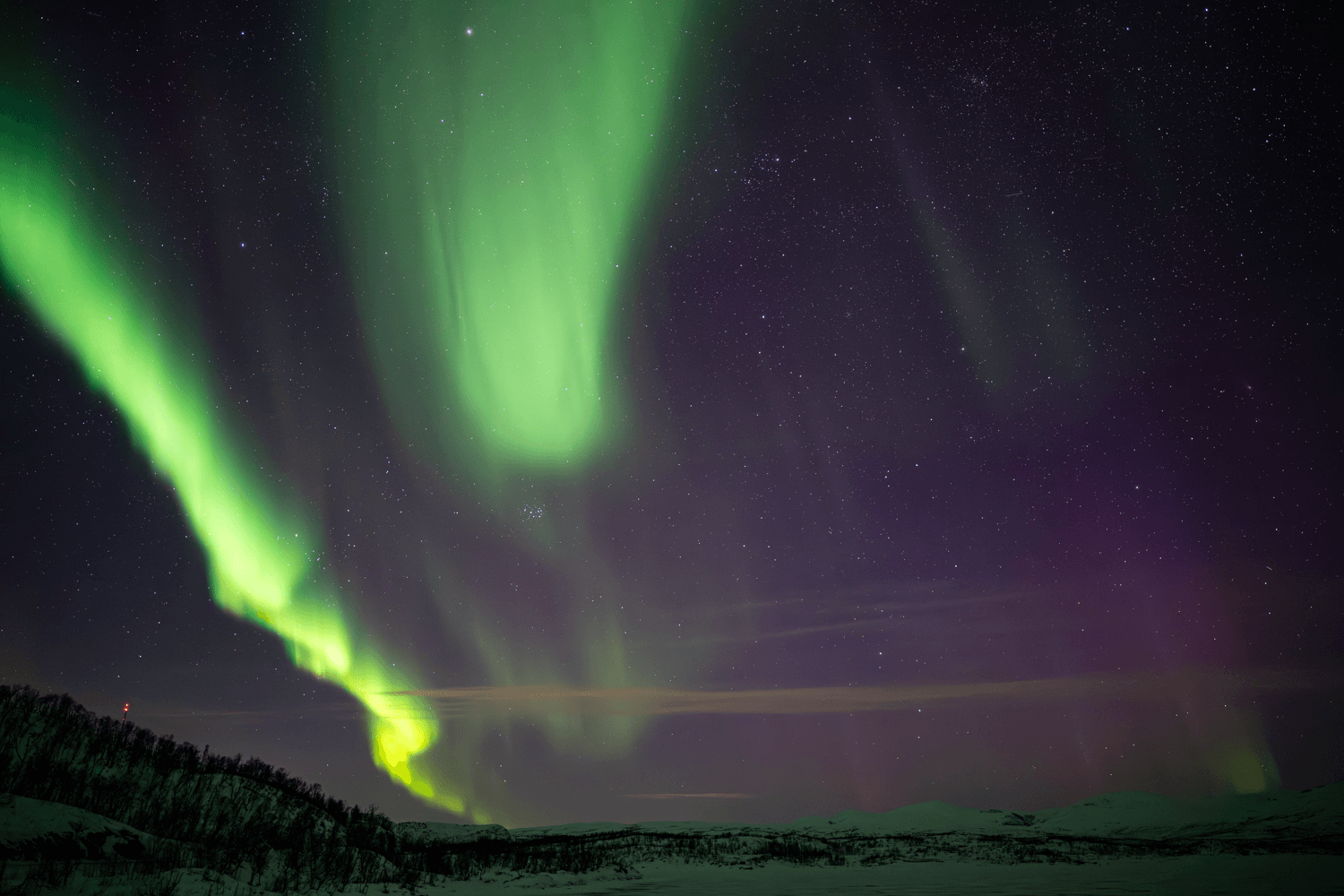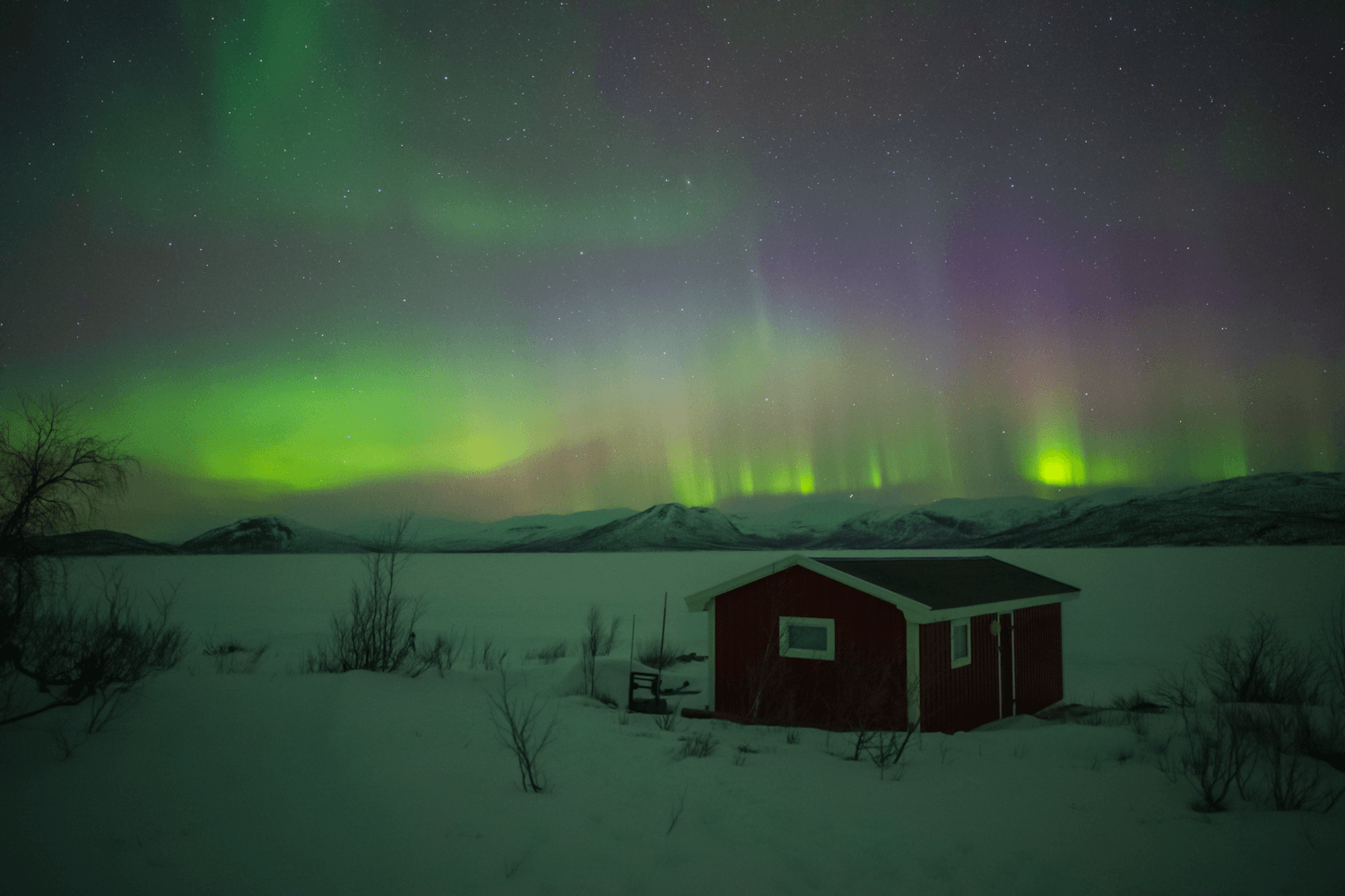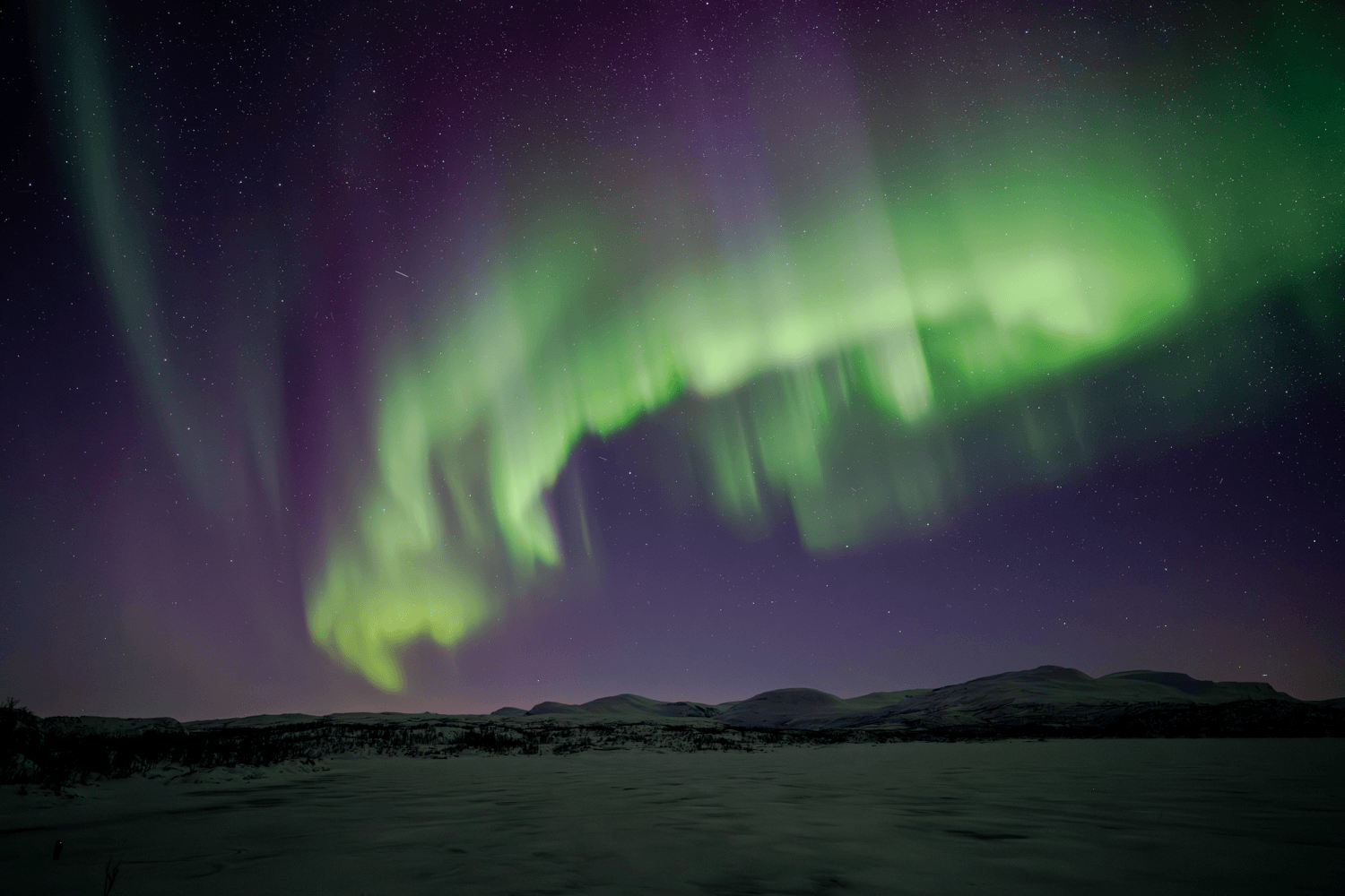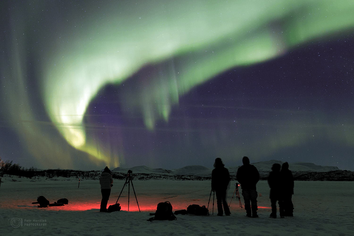 Ale zpátky o pár hodin. Předpověď počasí naší devítičlennou skupinu, tvořenou jedním osobákem a jednou dodávkou, vyhnalo z komfortní zóny švédského Gyljenu a Lansjärvu na předalekou pouť až k jezeru Torneträsk. Drsná severská krajina, občas vykoukl nějaký liščí huňatý ocásek či sobí paroží, občas někomu zapadl mobil pod sedadlo, prostě normálka. Tříhodinový přesun za soumraku se nesl na vlnách naděje z možné podmanivé show, kterou jsme si ostatně odbyli už tu předcházející noc. Každý teda tak nějak tušil, co čekat. Ale tušení to bylo fakt hodně vzdálené od reality. Všichni jsme se přepočítali mnohem víc než kuchařka ve školní jídelně za vypuknutí chřipkové epidemie.